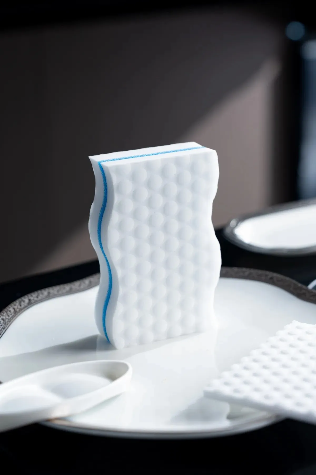 Melamine keeps its shape through many wet-dry rounds. The Tri-Layer Sandwich Embossed Melamine Sponge builds on this with a PU middle for extra toughness.