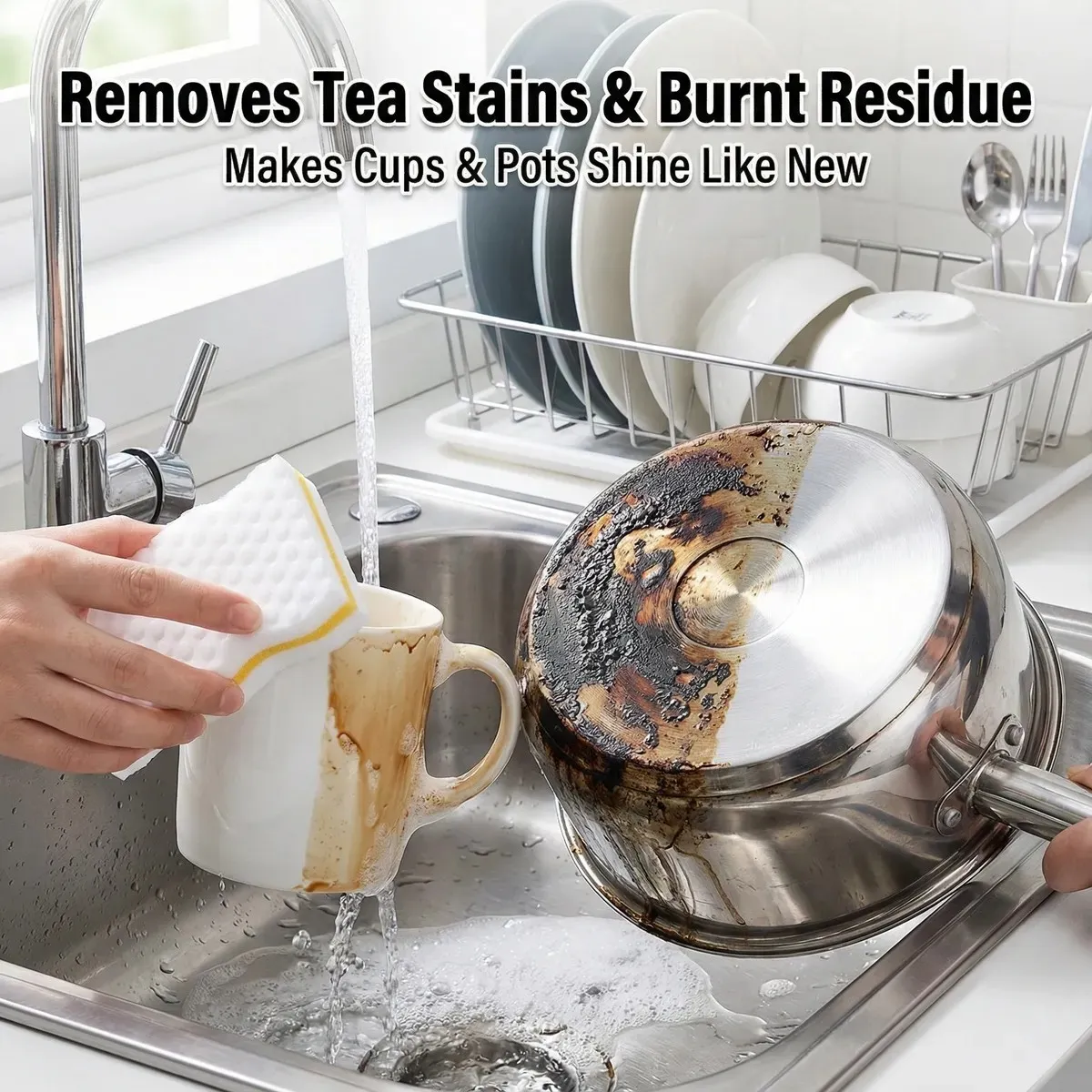 The Magic Cleaning Sponge includes a dense nano-melamine build, often in a three-layer composite setup. Its S-curve design matches hand shapes for improved grip, and the nano-capillary features work as tiny scrubbers to remove grease and marks with just water.