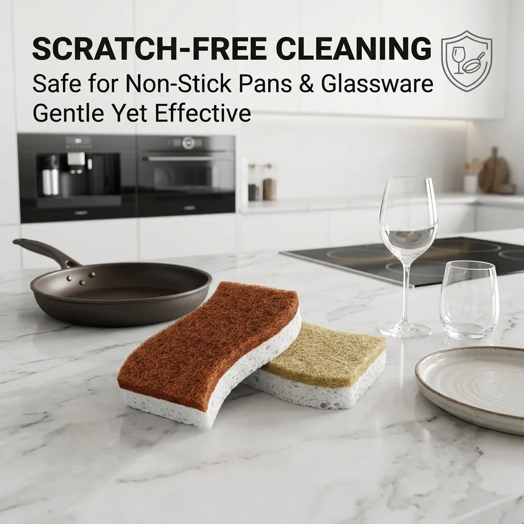 100% Plant-Based & Compostable The coconut fiber scrubber layer cuts through tough grease, while the ultra-absorbent cellulose foam locks in water. Both materials are fully compostable at the end of their lifespan, with zero plastic waste. Non-Scratch & Multi-Surface Safe Safe for dishes, non-stick pans, glassware, and countertops—no scratches, streaks, or residue left behind. Quick-Drying & Odor-Resistant The porous cellulose foam dries fast to prevent mold and unpleasant odors, keeping your sponge fresh for longer. Ergonomic S-Shape Design Contoured for a comfortable grip, reducing hand strain during extended cleaning tasks. Zero-Waste Eco Commitment Packaged in 100% recyclable cardboard, and we plant a tree for every purchase to offset your environmental footprint. Value 12-Pack Stock up with a 12-pack to keep your kitchen sustainable for months, with minimal waste from single-use sponges. 🧼 How to Use Wet the sponge to activate the cellulose foam’s absorbency and coconut fiber’s scrubbing power. Scrub gently on dishes, pans, or countertops—let the plant-based materials lift grime without harsh chemicals. Rinse thoroughly after use and air dry to maintain freshness and extend lifespan. Compost or recycle once worn out: cellulose foam goes in your compost bin, while the coconut fiber layer is recyclable. 🎯 For Eco-Conscious Homes & Businesses Perfect for sustainable homeowners, zero-waste enthusiasts, and eco-friendly foodservice businesses. We offer factory-direct wholesale pricing, custom branding, and bulk order support for retailers and distributors.
